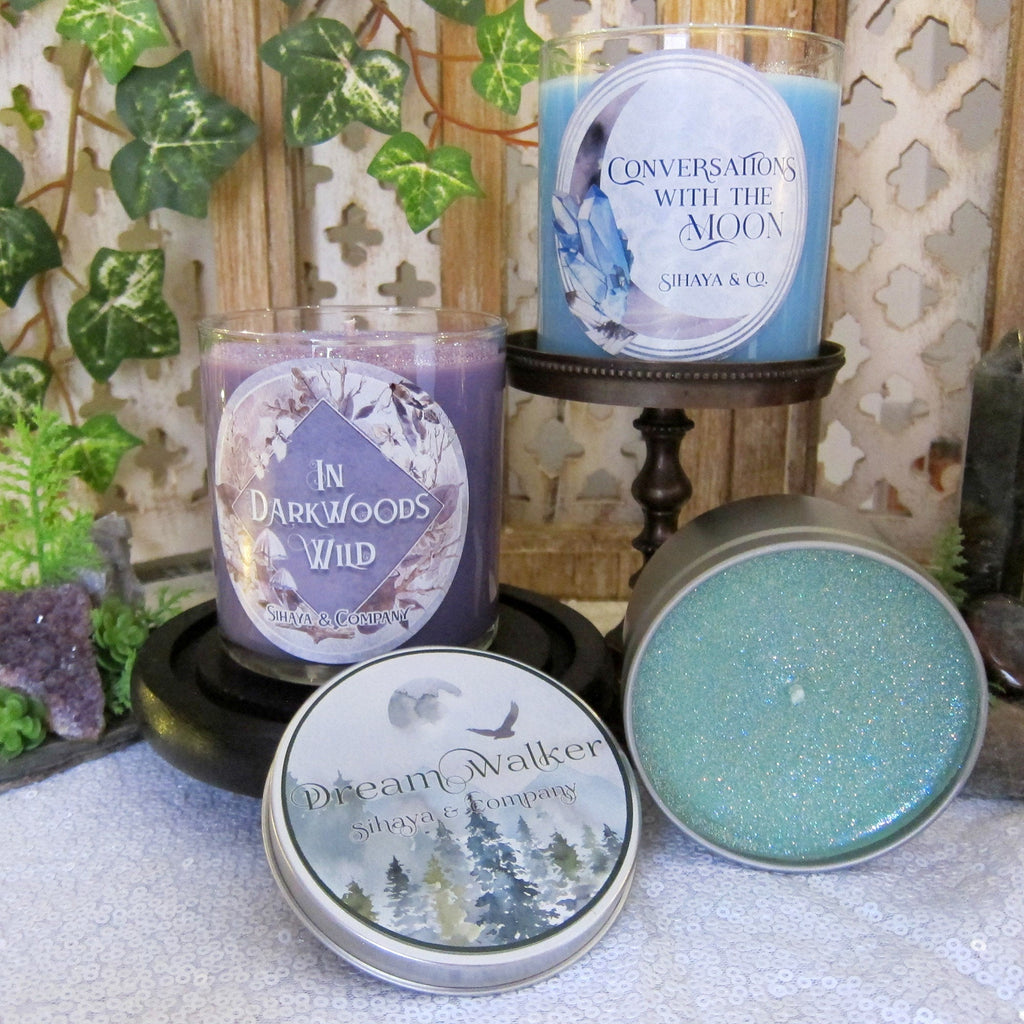 Tins: Our 8oz candle tin measures 3" wide by 2" deep, and holds approximately 7 oz of wax by weight. The wax is topped with an overspray of iridescent glitter. The candles burn for approximately 30-35 hours.